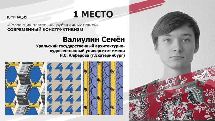 I место в номинации «Коллекция плательно-рубашечных тканей», тема «Современный конструктивизм» – Валиулин Семён, коллекция «Электростроительная пятилетка» (рук. О.Е. Матвеева, конс. А.А. Мухаркина).