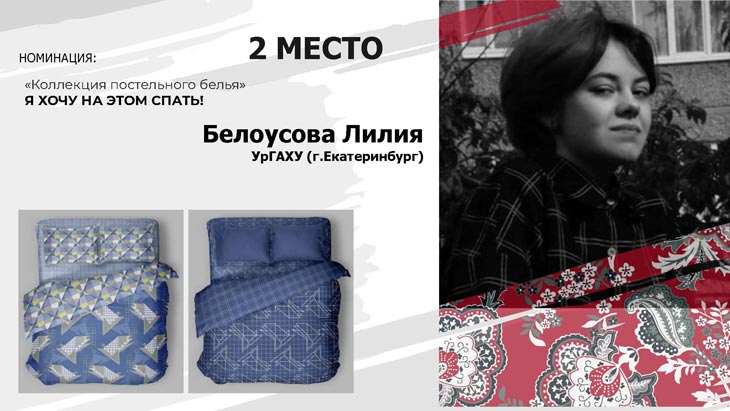 II место в номинации «Коллекция постельного белья», тема «Я хочу на этом спать» – Белоусова Лилия, коллекция «Оригами» (рук. Г.Б. Храмцова, конс. А.А. Мухаркина).