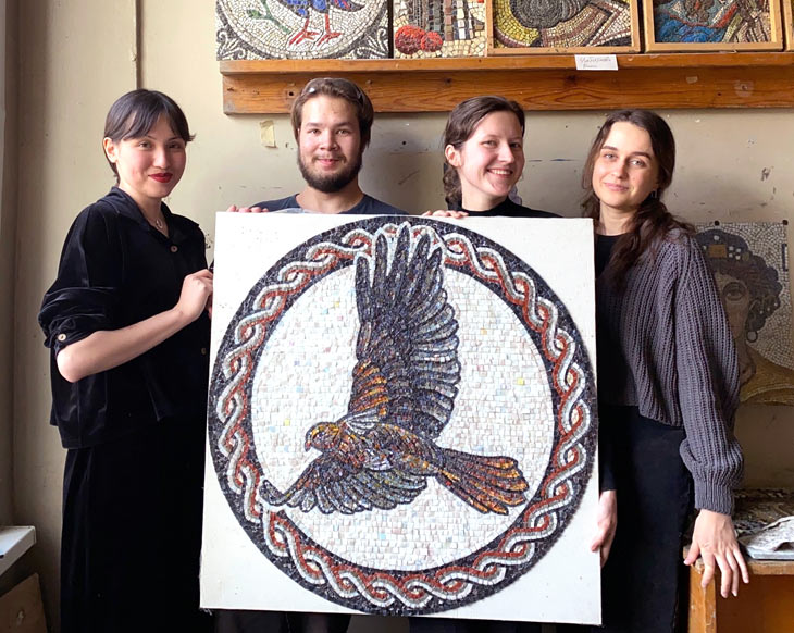Студенты УрГАХУ представили проект мозаики «Болотный лунь». На создание панно ушло несколько месяцев, так как техника мозаики сложна и трудоемка. Сейчас работа отправилась в Омск.